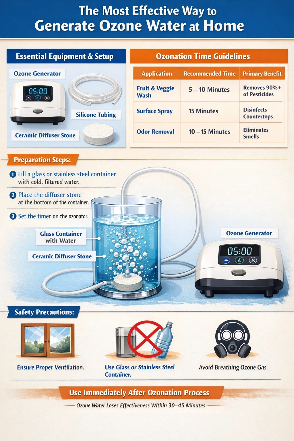 Tehokkaan luomiseen otsoni vettä kotona luotettavin tapa on käyttää a asuin otsonigeneraattori (tunnetaan myös nimellä otsonaattori), joka on varustettu ilmastuskivellä. Vaikka otsonia esiintyy luonnossa, desinfiointiin riittävän vahvan pitoisuuden tuottaminen vaatii hallittua sähköpurkausta hapen muuttamiseksi otsonikaasuksi, joka sitten kuplitetaan veteen.