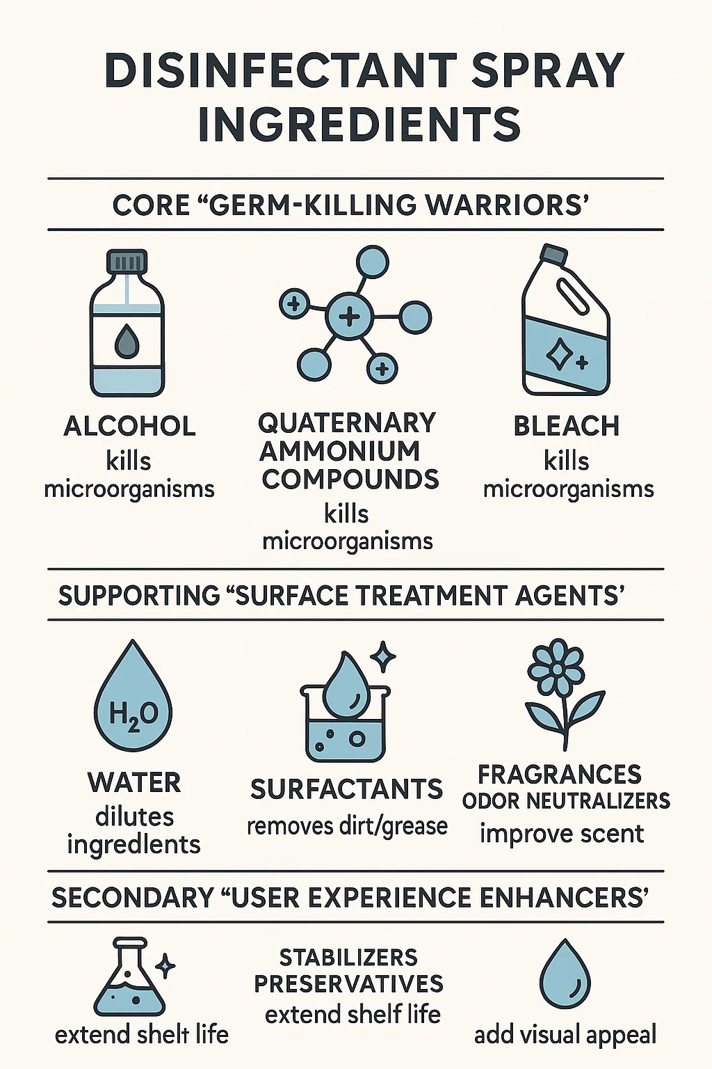 Luodaksesi tehokkaan desinfioiva suihke , tärkeimmät "sankari"-ainesosat voidaan luokitella laajasti seuraavasti: