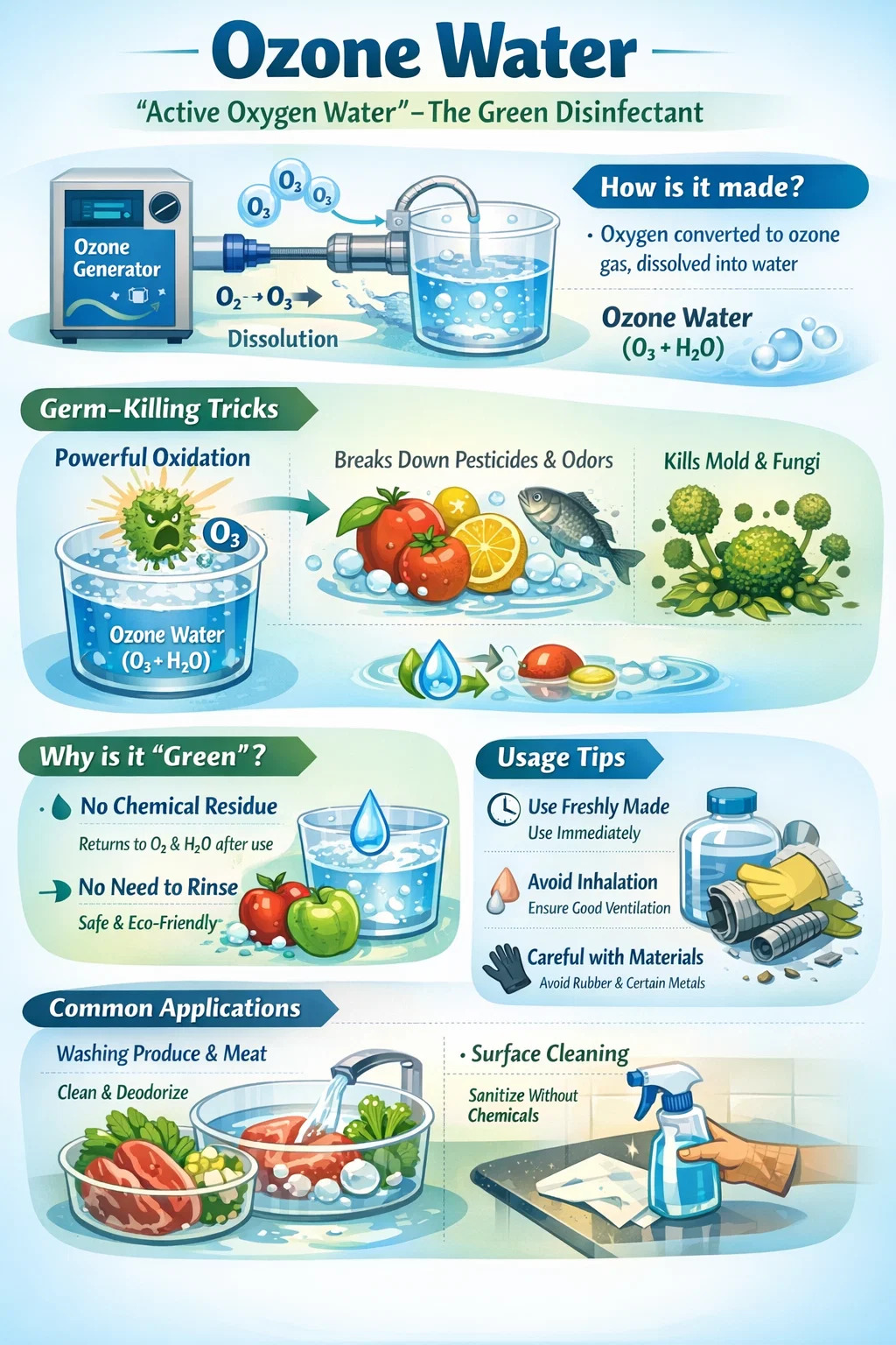 "Lyö, kun rauta on kuuma": Otsoni ei pysy vedessä kauan; jos se jätetään liian pitkäksi aikaa tai liian korkeaan lämpötilaan, se karkaa ja palaa hapeksi. Siksi otsonivesi on valmistettava ja käytettävä välittömästi; jos jätetään liian pitkäksi, siitä tulee tavallista vettä. Vältä suoraa ja pitkäaikaista hengittämistä: Vaikka se on liuennut veteen, pieni määrä otsonia saattaa vapautua ilmaan tuotantoprosessin aikana. Voimakas ruohon haju voi aiheuttaa epämukavuutta nenässä ja kurkussa, jos sitä hengitetään liikaa, joten on parasta varmistaa hyvä ilmanvaihto käytön aikana.